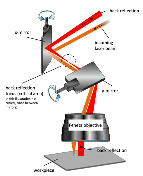 It should be noted that back reflections from transmitting components (lenses, protective glasses) occur at both the entrance and exit surfaces. The back reflections become particularly critical if they are focused by a lens on their way through the deflection unit and the focus thus generated is close to another (optical) component.
