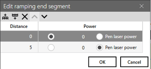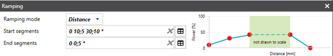 In the example above, power starts at 10% at 0 mm, ramps up to 30% at 5 mm, and reaches the pen’s set power level at 10 mm, indicated by an asterisk as a placeholder. A click on the table symbol
