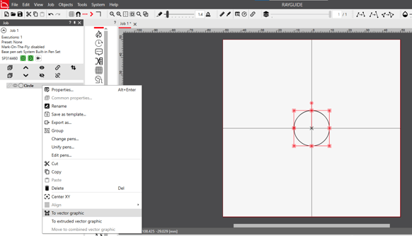 To create a 380° arc, begin by using the appropriate function to generate a circle. After the circle is created, right-click on it in the object list and choose the option "Convert to Vector Graphic."